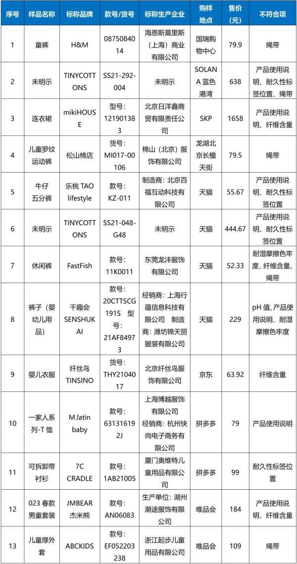 上千元的童装纤维含量竟不达标,H&M、mikiHOUSE等13款童装被点名
